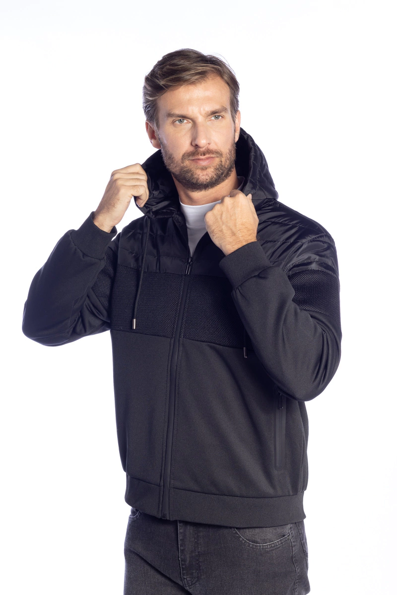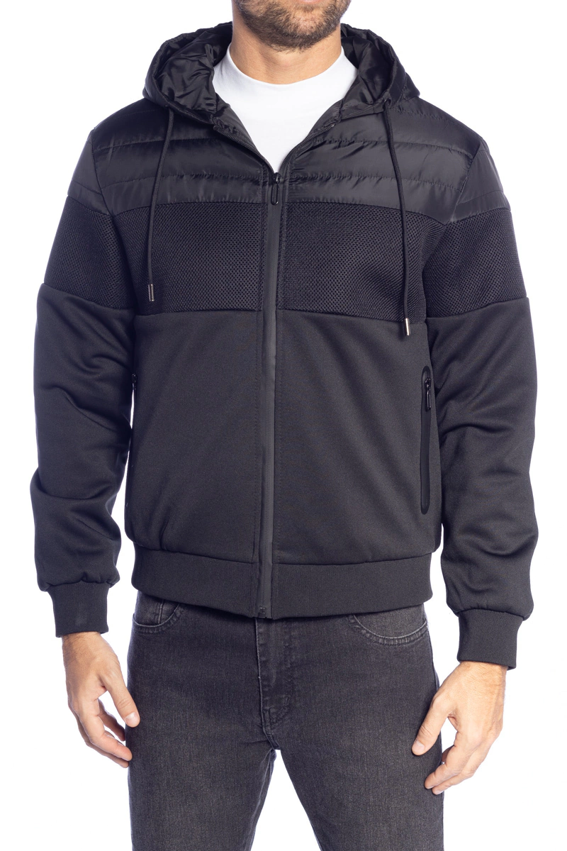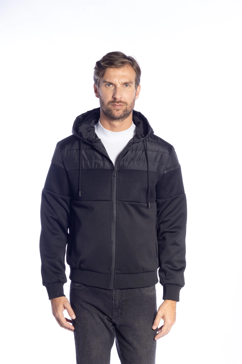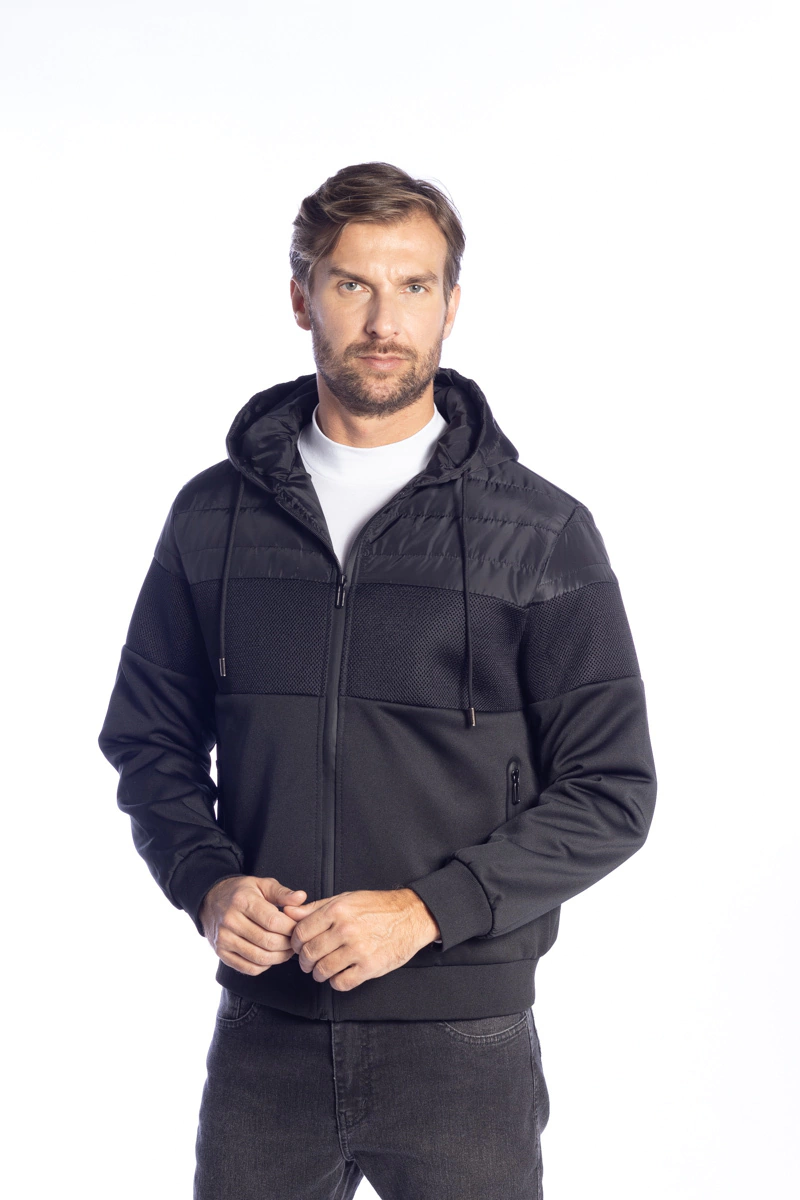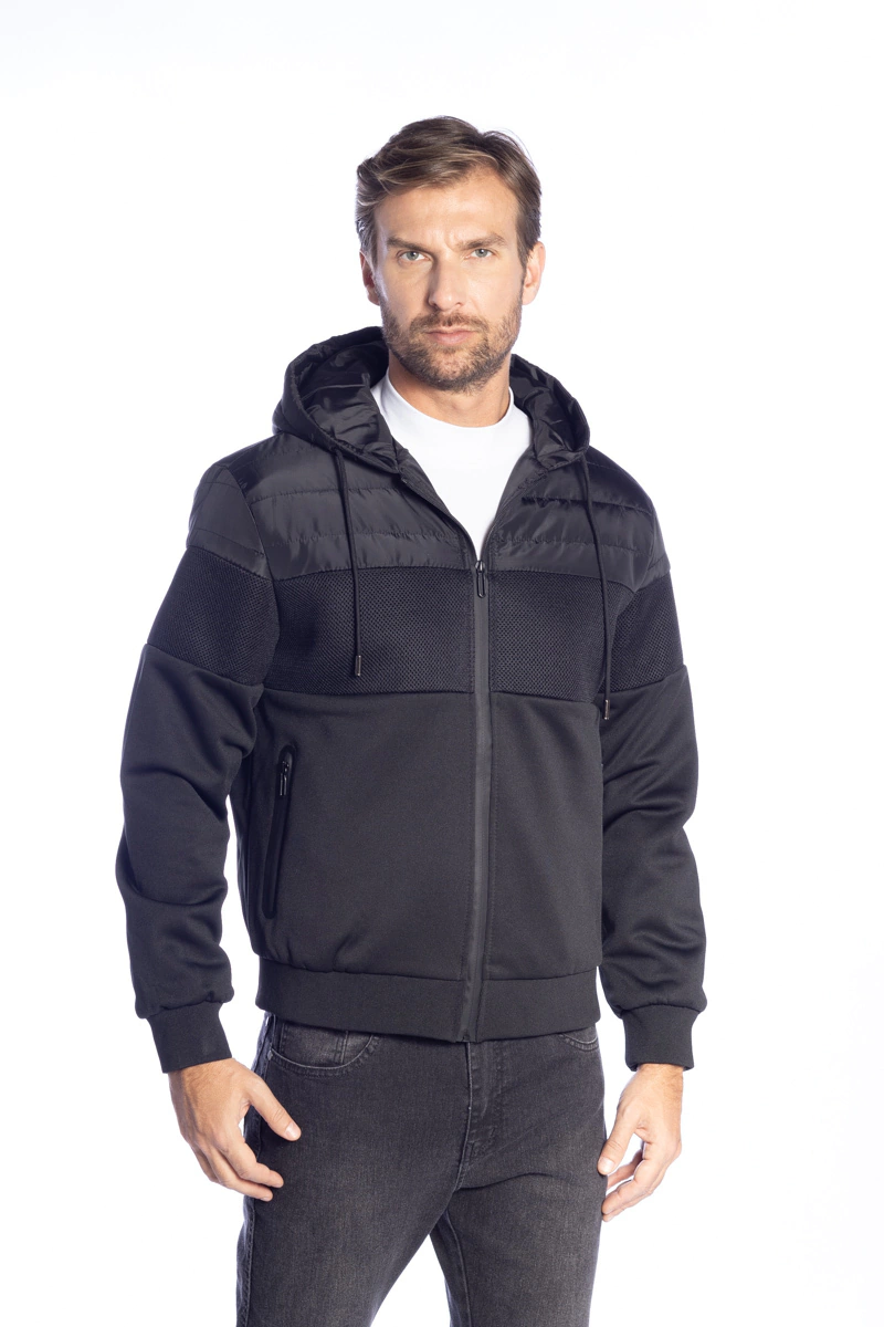 Jaqueta esporte de helanca preta com capuz. Dois bolsos laterais com zíper. Elástico na barra e punho.