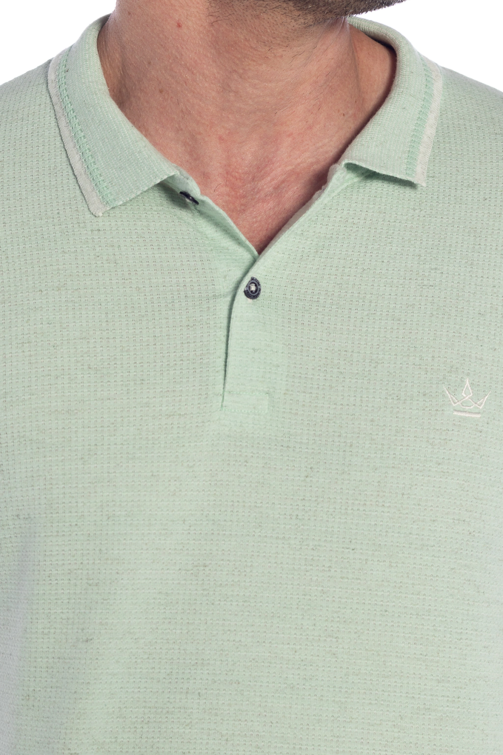 Polo linho canelada verde. Possui dois botões na vista e punho nas mangas. Use com bermudas, calça jeans ou calça de sarja.