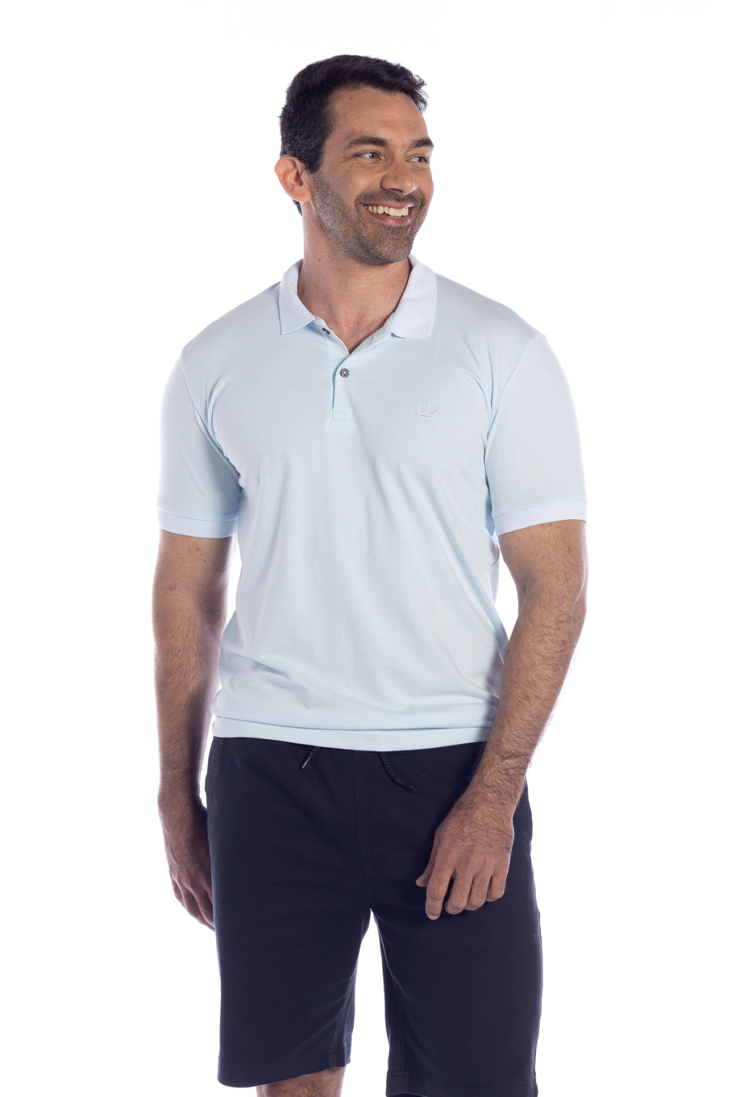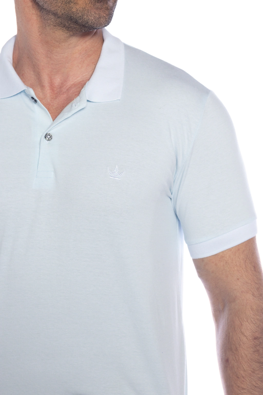 Polo verde água micro listra com elastano. Possui dois botões na vista e punho nas mangas. Produto desenvolvido e fabricado no Brasil